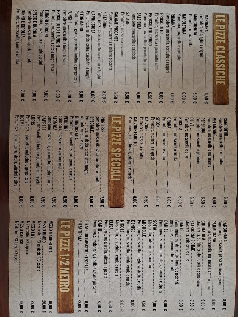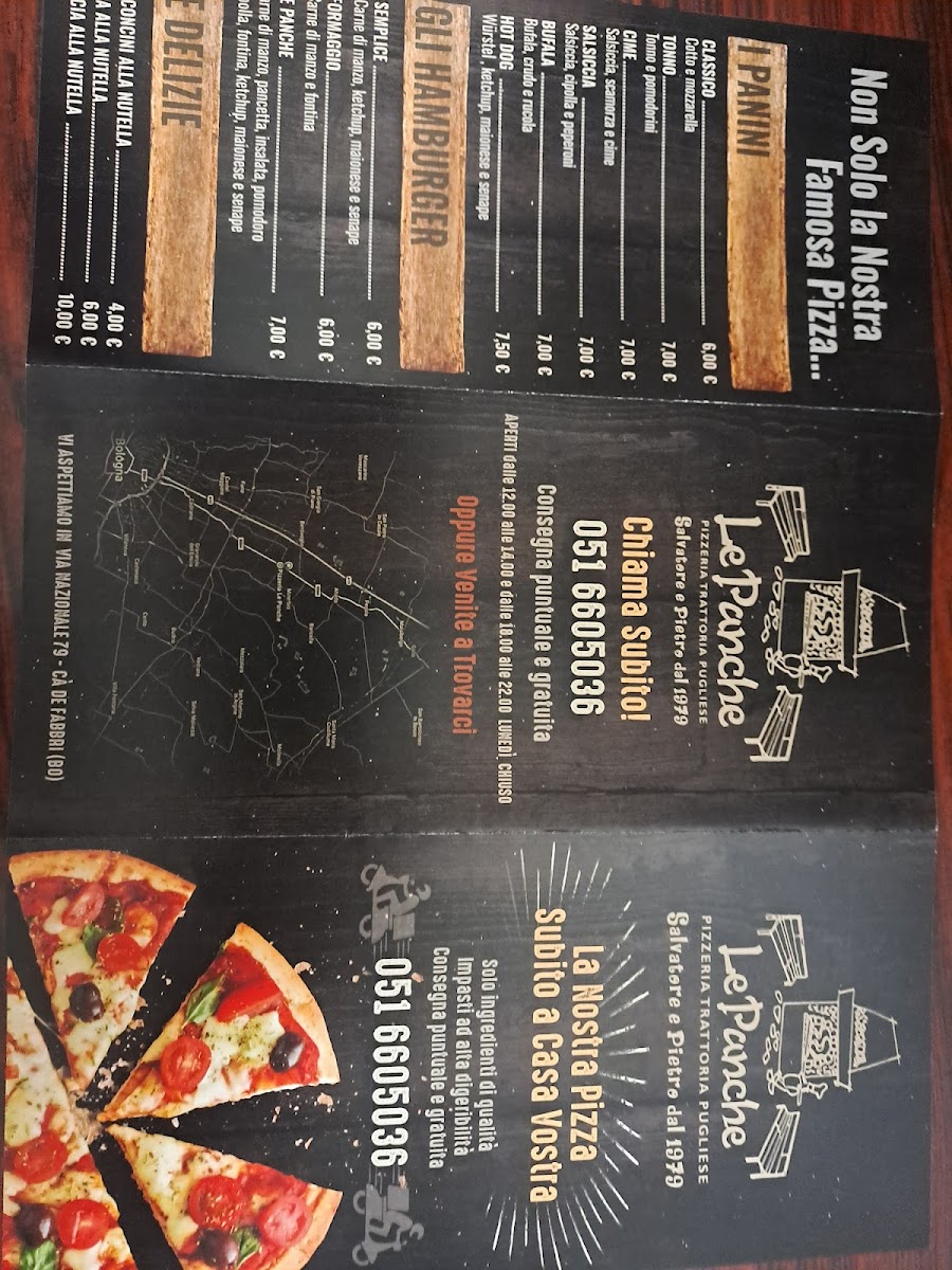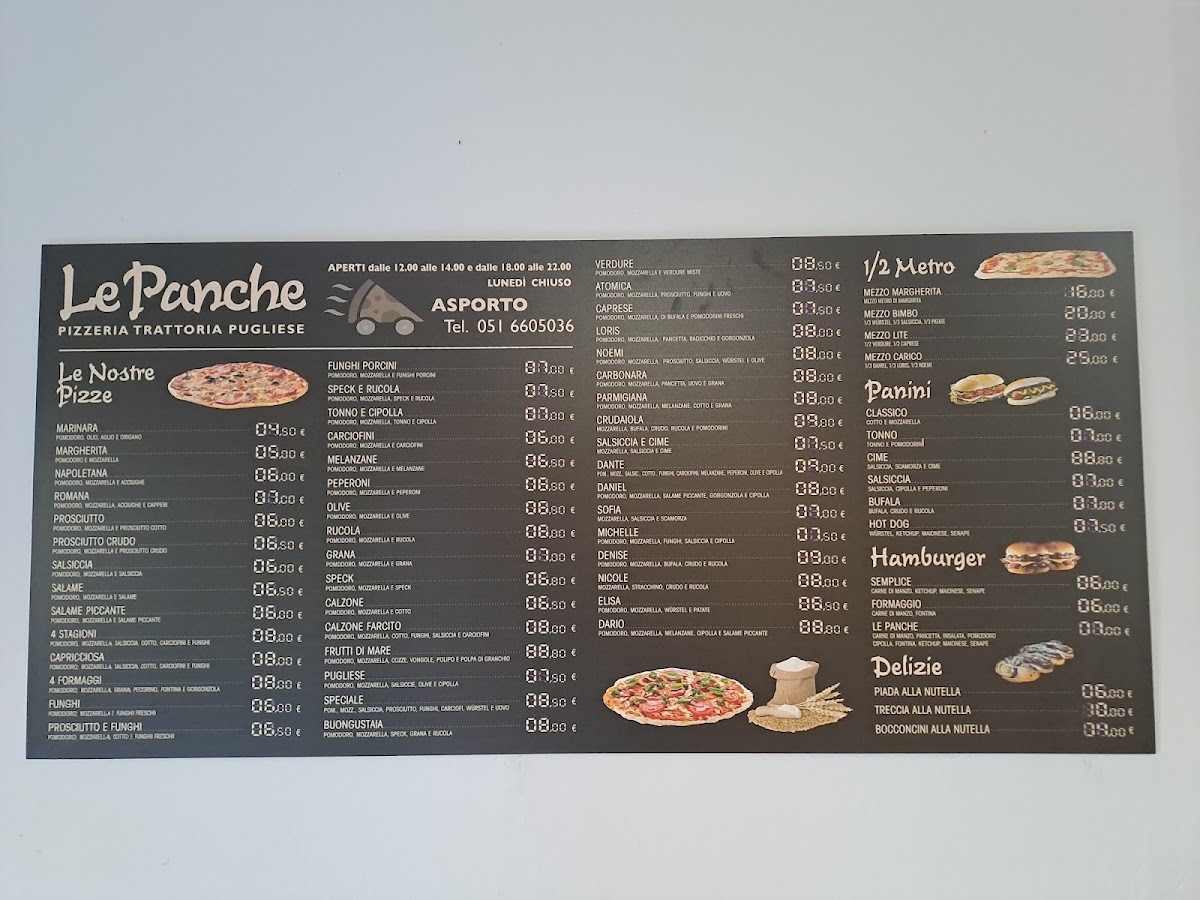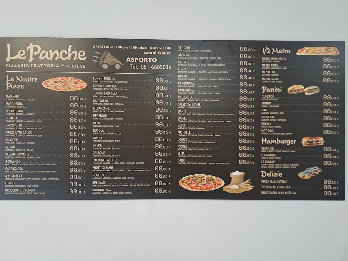 The menu at Pizzeria Le Panche in Via Nazionale, 79, 40061 Cà Dé Fabbri BO, Italy, offers an enticing selection of pizzas and Italian specialties, providing a delightful experience for any lover of authentic Italian cuisine. Among the standout offerings is the Pizza Bufala Crudo Rukola Pomodorini Tutto In Uscita, a rich combination of fresh buffalo mozzarella, prosciutto crudo, arugula, and cherry tomatoes. Another delicious choice is the Pizza Salsiccia Radicchio Funghi Olive, which pairs Italian sausage with bitter radicchio, mushrooms, and olives for a flavorful and balanced bite.
